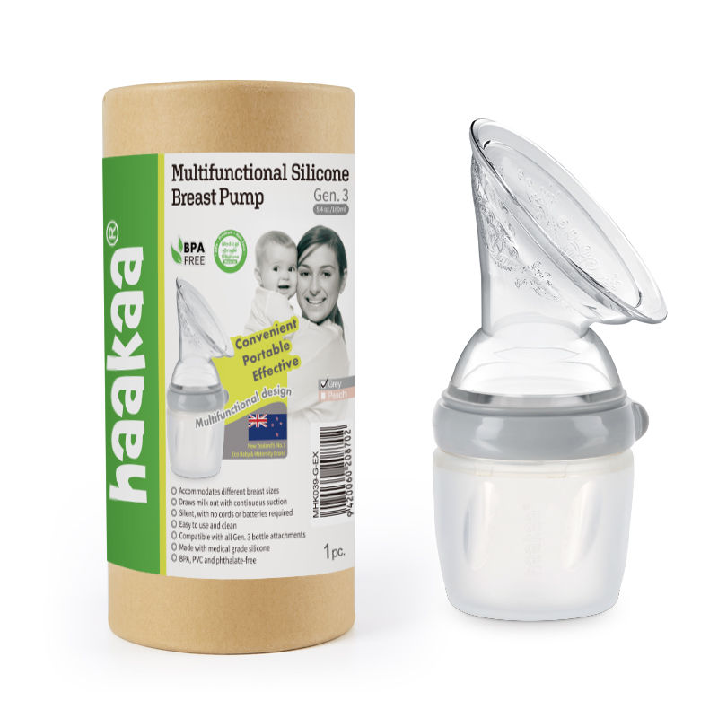 Our famous Haakaa Silicone Breast Pump has been reinvented again! We have kept the same simple and effective design that you know and love, except now you can express directly into a detachable silicone bottle! Our new Gen. 3 Pump comes in two convenient sizes of 160ml and 250ml and is compatible with all of our brand-new silicone bottle range attachments. With a quick twist of the top, you can swap out your breast pump flange for any of our range of optional interchangeable attachments (each sold separately). We have a baby bottle lid to let you feed your little one expressed milk, a feeding spoon dispenser for when your baby moves on to solids, a sippy bottle top to help your independent toddler transition from a bottle to a cup and sealing disks to preserve any leftover food or milk after feeding. Made from food-grade silicone, this compact pump is perfect for long-distance plane or car rides, or simply anywhere you would like to express quickly and discreetly. Features: - Quality food grade silicone - Easy and effective milk expression - No cords or batteries required - Compatible with all Generation 3 Silicone Bottle range attachments. - Small, portable and convenient. - Accommodates different breast sizes - Available in 160ml and 250ml capacities - Safe in microwaves, boiling water and sterilisers. - BPA, PVC and phthalate-free - This pump is made up of one silicone bottle base, one attachment ring and one silicone pump flange attachment. Cleaning and Care: Clean after each use. We strongly recommend cleaning and sterilising your Haakaa Breast Pump with any steam sterilising system or by boiling in water for 3-5 minutes. Do not use any bleach-based agents or sterilising tablets to clean this product. Do not boil PP attachment ring. Do not use UV sterilisers to clean this product as it may impact the lifespan of your pump. Caution: Check product condition regularly. Replace if this product shows any signs of damage. Do not store near any sharp objects. Only soft bristle brushes or soft sponges should be used to clean this product as hard scourers may scratch the surface. Exposure to detergent may make the silicone in this product appear cloudy. This product is not a toy. Do not use this product for anything other than its intended use. Store product in a cool, dry place and avoid direct sunlight. Adult supervision is required.